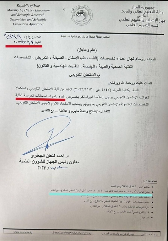 وجهت وزارة التعليم العالي الكليات البدء بإجراء امتحانات تجريبية للمشمولين بالامتحانات التقويمية، لغرض الإستعداد لخوض الإمتحانات التقويمية