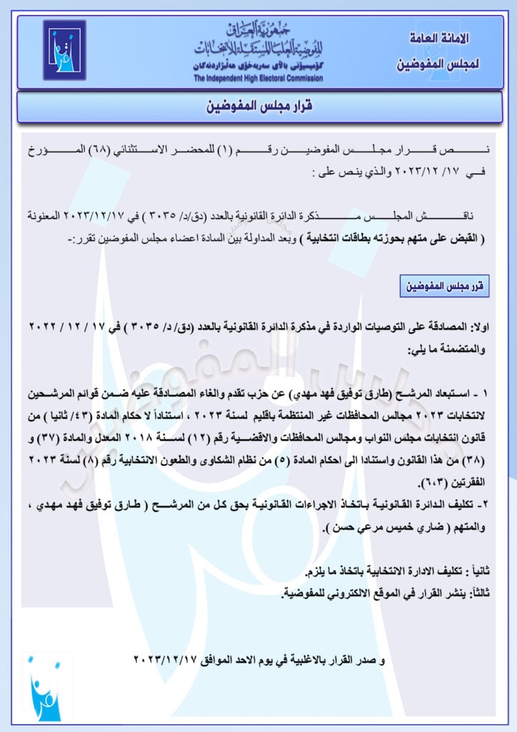 وكان مجلس المفوضين قد قرّر في قرار منفصل سابق استبعاد وإلغاء المصادقة على المرشح عن تقدم طارق توفيق فهد مهدي، بعد القبض على متهم بحوزته بطاقات انتخابية، كما كلف المجلس الدائرة القانونية باتخاذ الإجراءات القانونية بحق كل من المرشح طارق توفيق فهد، والمتهم ضاري
