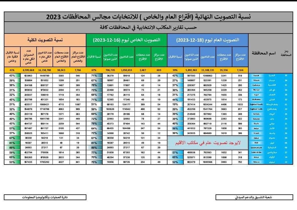واشار جدول نسب المشاركة في انتخابات مجالس المحافظات الى ان نسبة المشاركة في العام والخاص بلغت 41 بالمئة وان عدد المصوتين بلغ 6 ملايين و599 ألفاً و668 مواطناً.