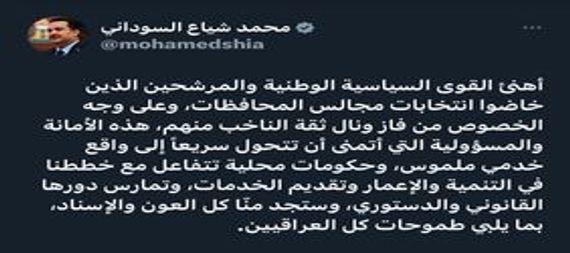 وقال السوداني في تدوينة على موقع X : " اهنئ القوى السياسية الوطنية والمرشحين الذين خاضوا انتخابات مجالس المحافظات، وعلى وجه الخصوص من فاز ونال ثقة الناخب منهم، هذه الامانة والمسؤولية التي اتمنى ان تتحول سريعاً الى واقع خدمي ملموس، وحكومات محلية تتفاعل مع خططنا في التنمية والاعمار وتقديم الخدمات، وتمارس دورها القانوني والدستوري، وستجد منّا كل العون والاسناد، بما يلبي طموحات كل العراقيين