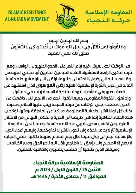 المقاومة الإسلامية حركة النجباء تنعى الشهيد القائد رضي الموسوي