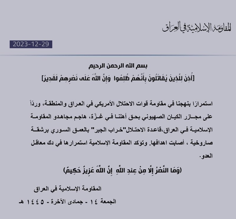 استمرارًا بنهجنا في مقاومة قوات الاحتلال الأمريكي في العراق والمنطقة، وردّاً على مجازر الكيان الصهيوني بحق أهلنا في غزّة، هاجم مجاهدو المقاومة الإسلامية في العراق،قاعدة الاحتلال"خراب الجير" بالعمق السوري برشقة صاروخية ، أصابت اهدافها. وتؤكد المقاومة الإسلامية استمرارها في دك معاقل العدو .