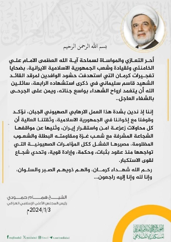 الشيخ همام حمودي: يدين ويسنتكر العمل الارهابي الصهيوني الذي حصل في كرمان
