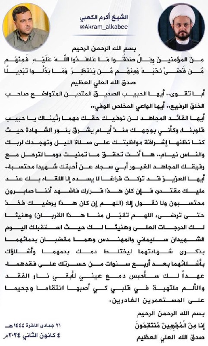 الامين العام لحركة النجباء الشيخ اكرم الكعبي ينعى الشهيد القائد ابو تقوى السعيدي