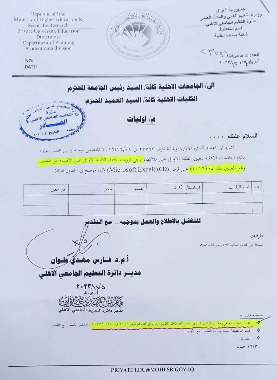 الزمت وزارة التعليم العالي والبحث العلمي، الجامعات والكليات الأهلية بتعيين الأوائل وفقاً لقرار مجلس الوزراء غير المفعل منذ عام ٢٠١٦، و المطالبة بالبيانات كخطوة أولى