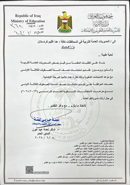 كما نوهت الوزارة حينها الى ان العطلة الربيعية ستبدأ بعد انتهاء امتحانات نصف السنة أي يوم الخميس الموافق (2024/2/1) لمدة اسبوعين على ان يستأنف الدوام يوم الخميس الموافق 2024/2/15، على ان يكون امتحان نصف السنة للمؤجلين في الاسبوع الثاني من بدء الدوام الرسمي ولمدة اسبوع واحد فقط.
