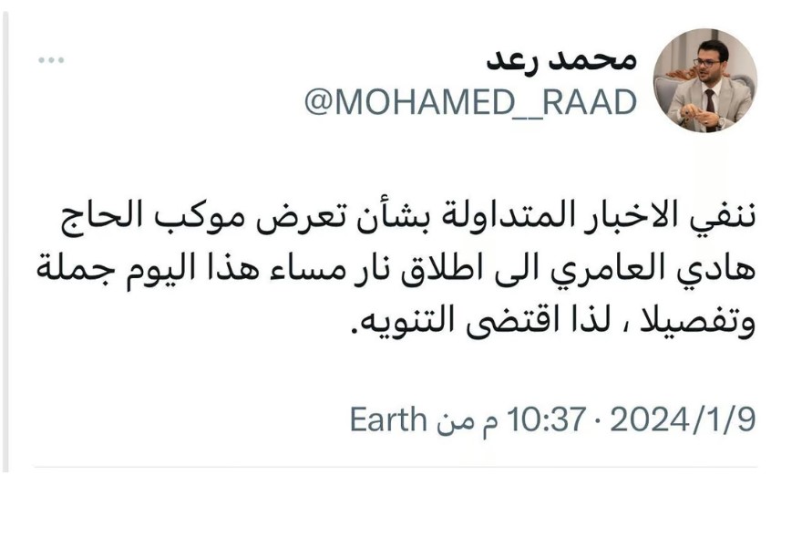 نفى مكتب رئيس تحالف نبني هادي العامري (أبو حسن)، مساء الثلاثاء، تعرض موكبه لإطلاق نار.