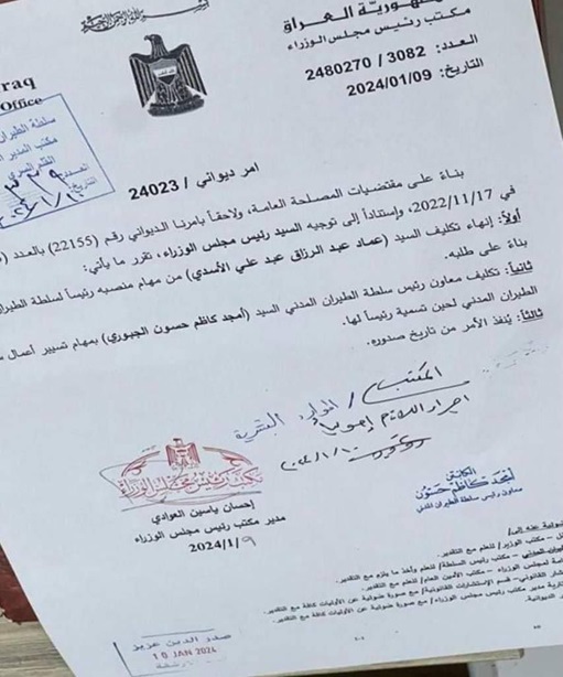 وجاء في امر ديواني:"استناداً إلى توجيه رئيس مجلس الوزراء ، تقرر إنهاء تكليف عماد عبد الرزاق عبد علي الأسدي من مهام منصبه رئيساً لسلطة الطيران المدني بناء على طلبه، وتكليف معاون رئيس سلطة الطيران المدني أمجد كاظم حسون الجبوري بمهام تسيير أعمال السلطة"