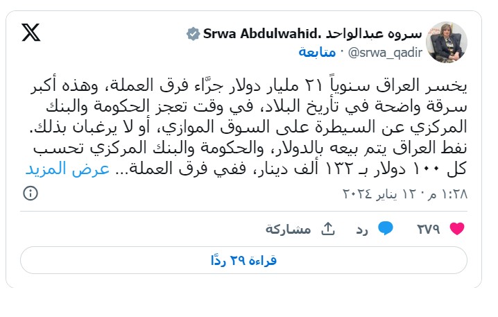 وقالت عبد الواحد في تغريدة "يخسر العراق سنوياً 21 مليار دولار جرَّاء فرق العملة، وهذه أكبر سرقة واضحة في تأريخ البلاد، في وقت تعجز الحكومة والبنك المركزي عن السيطرة على السوق الموازي، أو لا يرغبان بذلك".