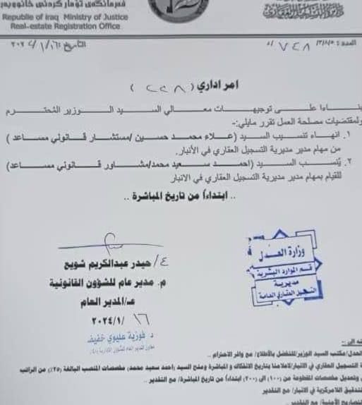 اصدرت وزارة العدل امرا اداريا بانهاء تنسيب علاء محمد حسين مدير التسجيل العقاري في الانبار ، وتنسيب احمد سعيد محمد بدلا منه