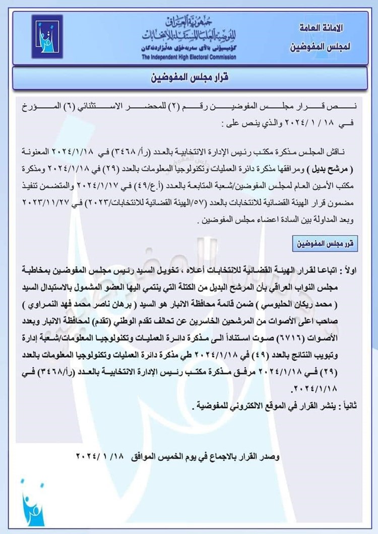 بالوثيقة..المفوضية تعلن اختيار النائب البديل لمحمد الحلبوسي في مجلس النواب