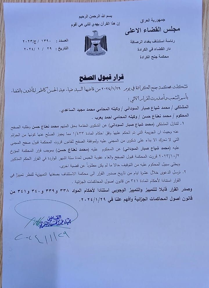 قرر القضاء العراقي قبول الصفح من رئيس الوزراء محمد شياع السوداني عن المحلل السياسي محمد نعناع ، بعد اعتذاره عن الاساءة الشخصية التي تضمنتها بعض كتاباته