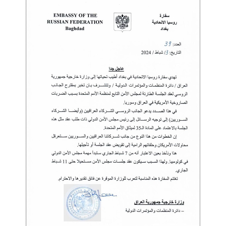 اقترحت روسيا على العراق وسوريا اللجوء الى مجلس الامن ومطالبته بعقد جلسة طارئة بعد الضربات الامريكية الاخيرة.