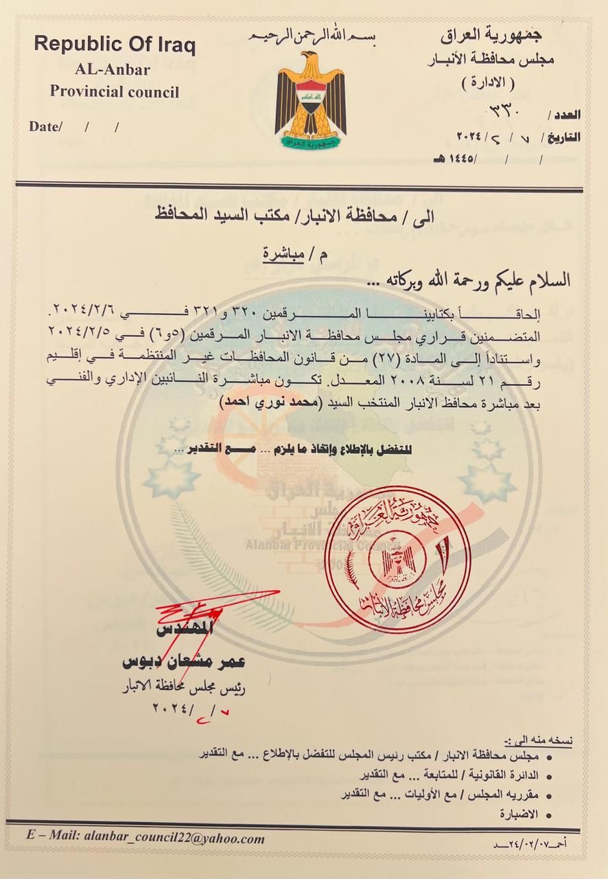 تداولت وسائل اعلام محلية، اليوم الجمعة، وثائق منسوبة لرئيس مجلس محافظة الانبار عمر مشعان الدبوس وضع عليها ختما بالعلم العراقي القديم.