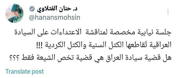 انتقدت النائب عن تحالف نبني حنان الفتلاوي ، عدم حضور ممثلي بعض المكونات للجلسة التداولية المنعقدة مساء اليوم السبت ، لمناقشة الاعتداءات على السيادة العراقية