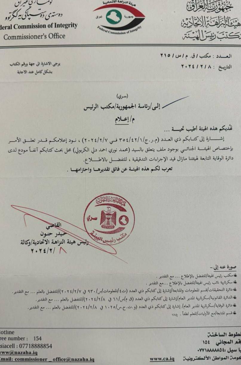 بالوثيقة هيئة النزاهة الاتحادية تخاطب رئاسة الجمهورية بخصوص محافظ الانبار الجديد محمد نوري الكربولي