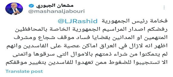كشف النائب السابق مشعان الجبوري عن رفض رئيس الجمهورية الدكتور عبد اللطيف جمال رشيد اصدار المراسيم الجمهورية الخاصة بالمحافظين المتهمين او المدانين بقضايا فساد.