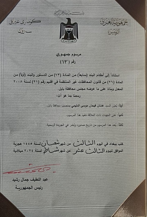 اعلنت الحكومة المحلية في بابل ان رئاسة الجمهورية اصدرت مرسوما جمهوريا بتعيين عدنان الفيحان محافظ للبابل.