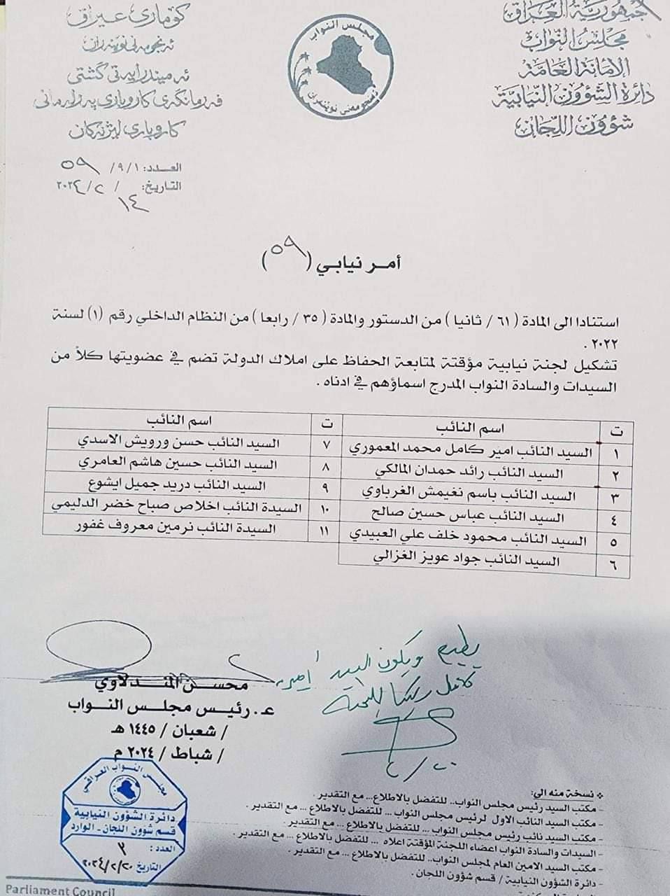 اصدرت رئاسة مجلس النواب ب امرا بتشكيل لجنة نيابية مؤقتة لمتابعة الحفاظ على املاك الدولة تضم ١١ نائبا ./