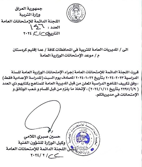 اظهرت وثيقة صادرة عن وزارة التربية، ، اليوم السبت (24 شباط 2024)، تحديد موعد الامتحانات الوزارية للصف السادس الإعدادي في 22 من حزيران 2024.