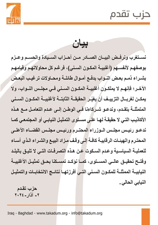 أعلن حزب تقدم برئاسة محمد الحلبوسي، مساء امس السبت، عن رفضه للبيان المشترك الذي صدر اليوم بشأن منصب رئيس البرلمان.
