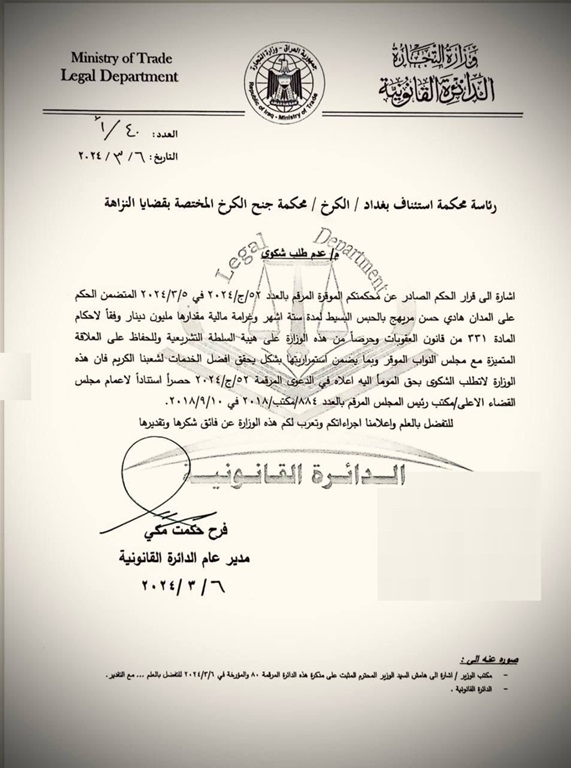 وجاء في الوثيقة الصادرة من الدائرة القانونية في وزارة التجارة أدناه نصها، "حرصا من الوزارة على هيبة السلطة التشريعية وللحفاظ على العلاقة المتميزة مع مجلس النواب وبما يضمن استمراريتها بشكل يحقق افضل الخدمات لشعبنا فإن الوزارة لا تطلب الشكوى بحقه استناداً لاعمام مجلس القضاء الاعلى".