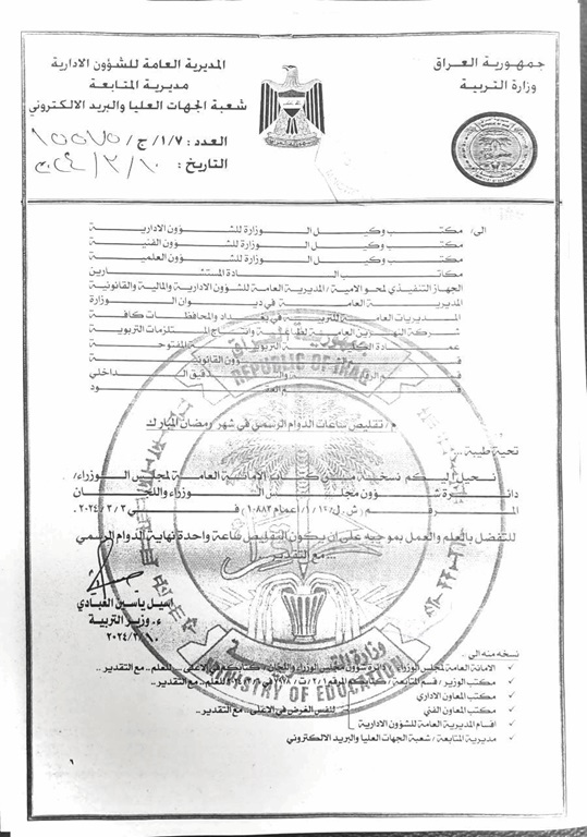 أصدرت وزارة التربية، اليوم الاحد، توضيحاً بشأن تقليص الدوام الرسمي (ساعة واحدة) للمؤسسات التربوية طوال ايام شهر رمضان.