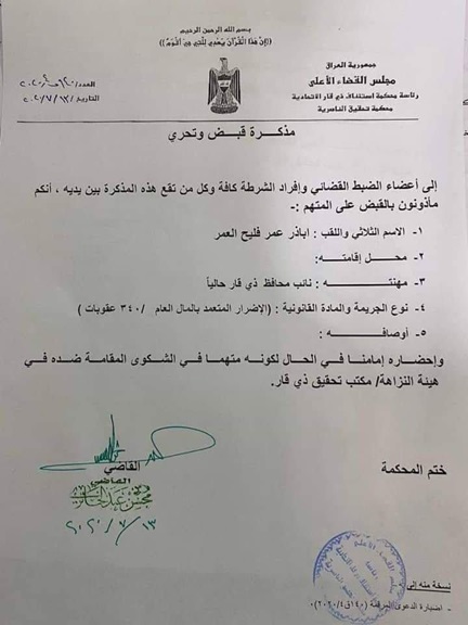 وجهت هيئة النزاهة الاتحادية بتفعيل مذكرة القاء القبض بحق نائب محافظ ذي قار السابق اباذر عمر والصادرة بحقه بتاريخ 2020/7/13 بتهمة الاضرار المتعمد بالمال العام.