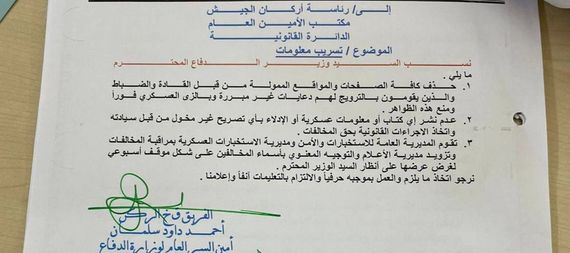 كما وجه الوزير" بعدم نشر إي كتاب أو معلومات عسكرية أو الإدلاء بأي تصريح غير مخول من قبله واتخاذ الاجراءات القانونية بحق المخالفين".