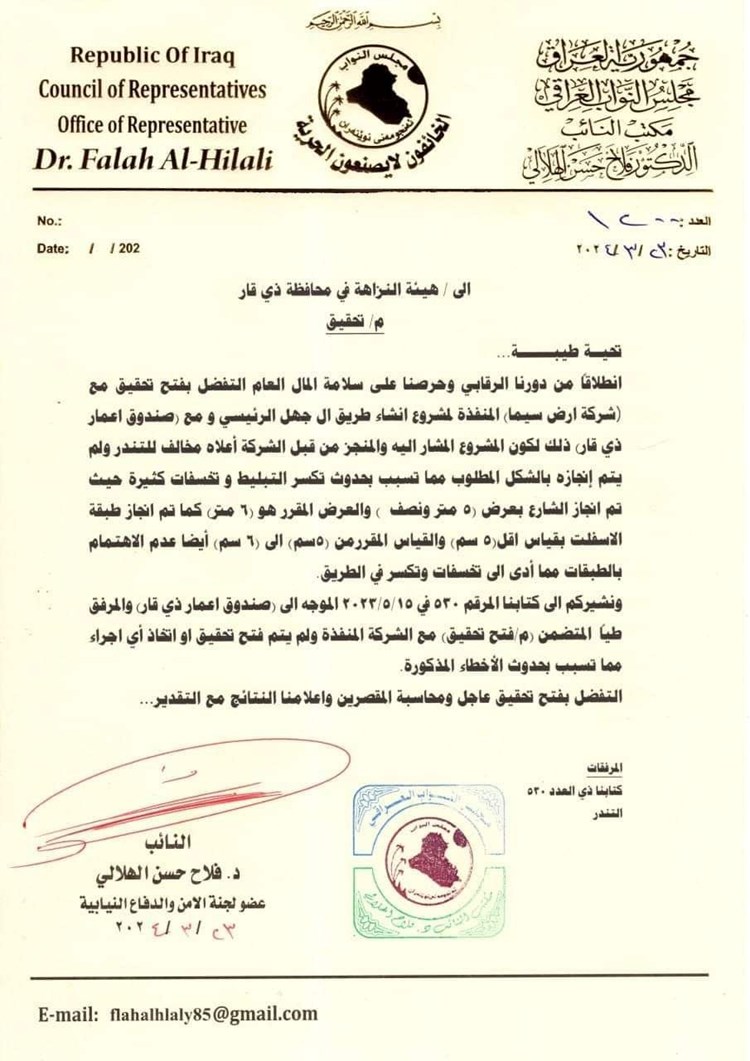 بالوثيقة .. توجيه طلب نيابي الى النزاهة للتحقيق بمشروع طريق تعرض للتخسف في ذي قار