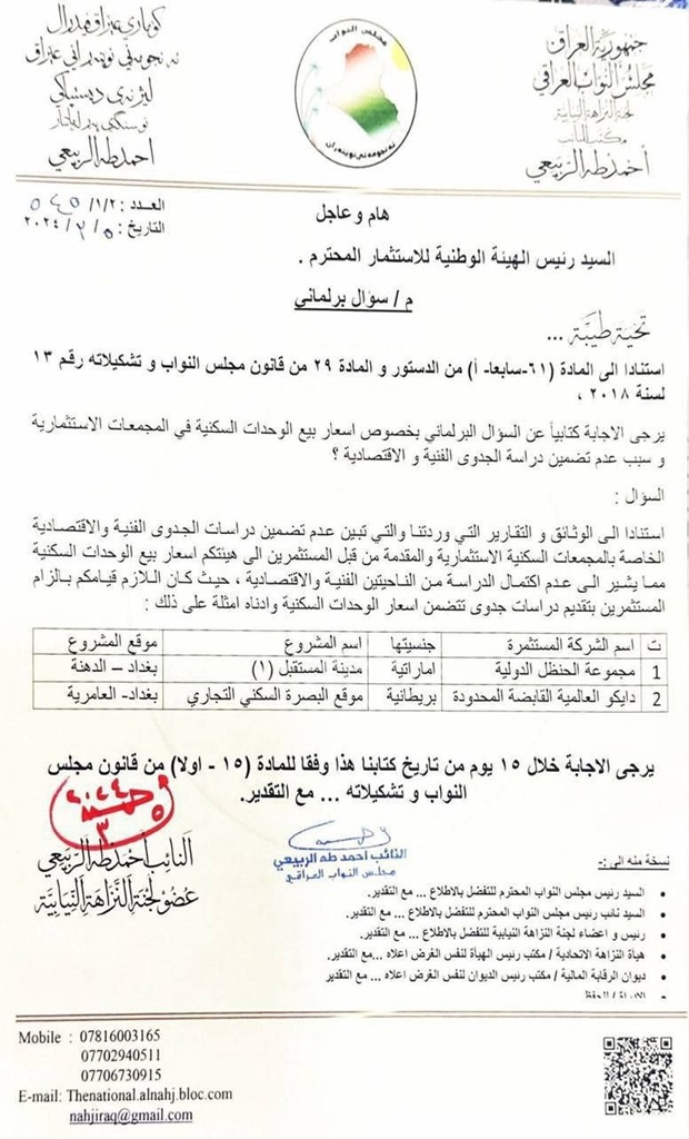 تنشر السومرية نيوز، وثيقة تتضمن سؤالاً برلمانياً موجهاً لرئيس هيئة الاستثمار يخص الوحدات السكنية في المجمعات الاستثمارية.