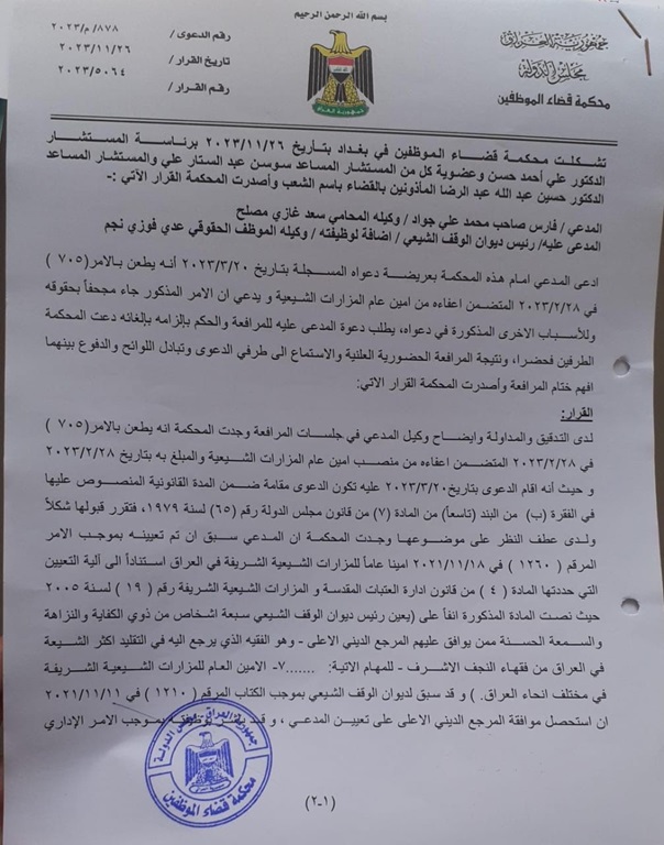 أظهرت وثيقة قضائية رسمية كسب أمين عام المزارات الشيعية فارس الرماحي تظلماً وطعناً قضائياً ضدّ رئيس ديوان الوقف الشيعي الدكتور حيدر الشمري حول عدم قانونية إجراءات إعفائه من منصبه.