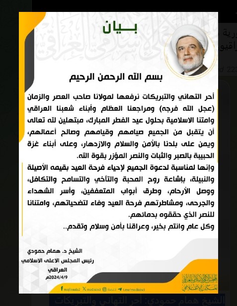 الشيخ همام حمودي يهنيء صاحب العصر والزمان والمراجع العظام والامة الاسلامية بحلول عيد الفطر المبارك
