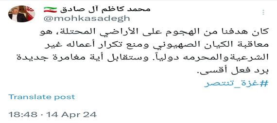 وقال السفير في تدوينة على موقع /اكس/ : "كان هدفنا من الهجوم على الاراضي المحتلة، هو معاقبة الكيان الصهيوني ومنع تكرار اعماله غير الشرعيةوالمحرمة دولياً ، وستقابل اية مغامرة جديدة برد فعل اقسى".