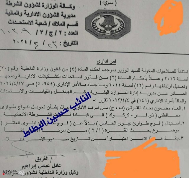 أظهرت وثيقة نشرها النائب حسين البطاط الغاء وزارة الداخلية أمر تحويل أفواج طوارئ في ذي قار وكركوك الى الشرطة الإتحادية./