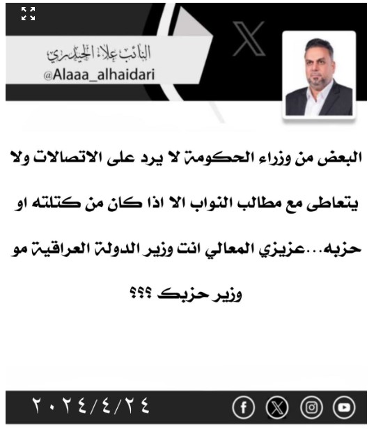 انتقد النائب عن محافظة البصرة علاء الحيدري، اليوم الأربعاء، ازدواجية بعض الوزراء للاستجابة لنواب كتلهم واحزابهم دون النواب الاخرين.