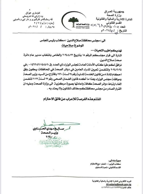 رفض وزير الصحة الدكتور صالح مهدي الحسناوي قرار مجلس محافظة صلاح الدين بتعيين مدير صحة جديد للمحافظة، كون ذلك اختصاص حصري بالوزير وفقا لقانون الخدمة المدنية.