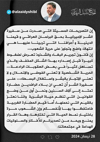 وتابع الزيدي، أنه "على سفيرة الشر أن تعي ان بلاد الرافدين حضارة تمتد إلى آلاف السنين ونحن أول من وضع القوانين التي تنظم حياة البشرية واننا نعتز بالقيم التي نحملها، أما قيم الحضارة الغربية فاحتفظوا بها لأنفسكم وإن الشعوب حرة باختيار نمط الحياة التي تختارها، وهذا القرار يمنع ويحد من تصديركم للأفكار والسلوكيات الهدامة في مجتمعاتنا".