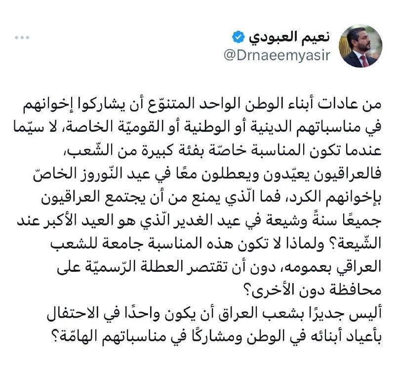 وزير التعليم العالي نعيم العبودي: ما الذي يمنع من ان يجتمع العراقيون جميعا سنة وشيعة في عيد الغدير الذي هو العيد الاكبر عند الشيعة؟