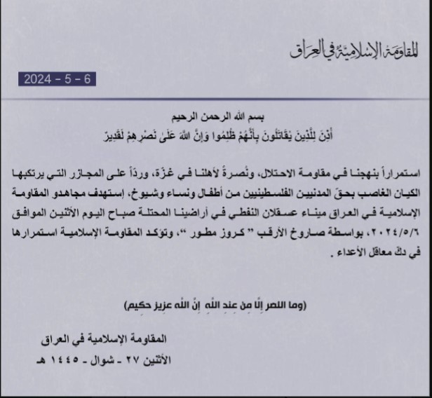 المقاومة الاسلامية في العراق تقصف ميناء عسقلان النفطي بواسطة صاروخ الأرقب “ كروز مطور ”