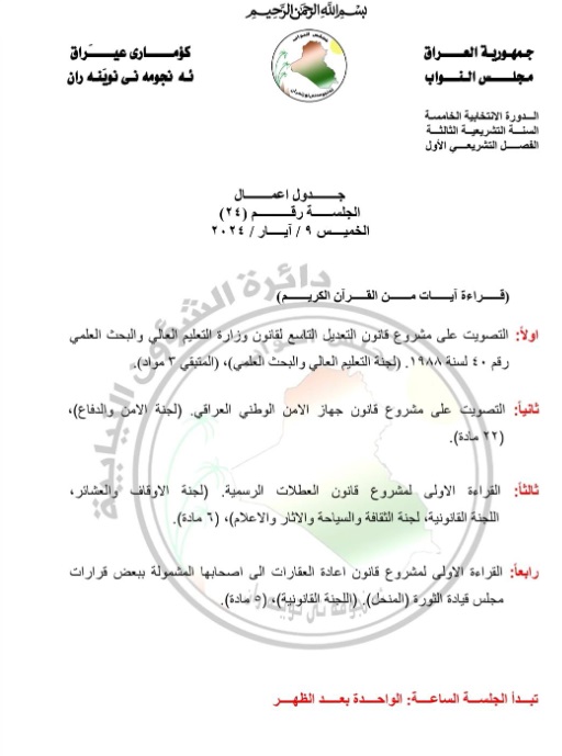 وبحسب الجدول فأن الجلسة تضمنت التصويت على مشروع قانون التعديل التاسع لقانون وزارة التعليم العالي والبحث العلمي، والتصويت على قانون جهاز الامن الوطني.