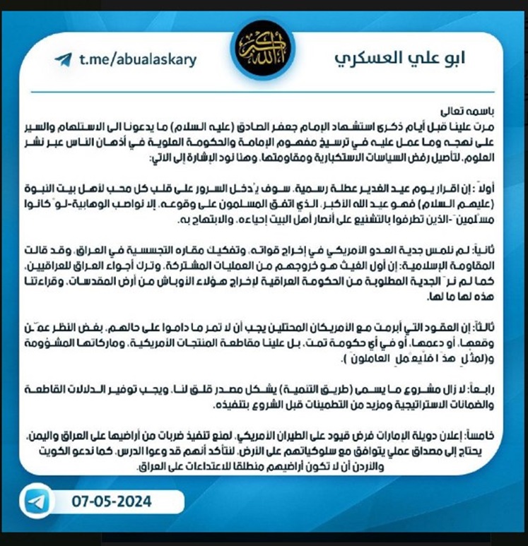 المسؤول الامني لكتائب حزب الله: لم نلمس جدية العدو الأمريكي في إخراج قواته، وتفكيك مقاره التجسسية في العراق