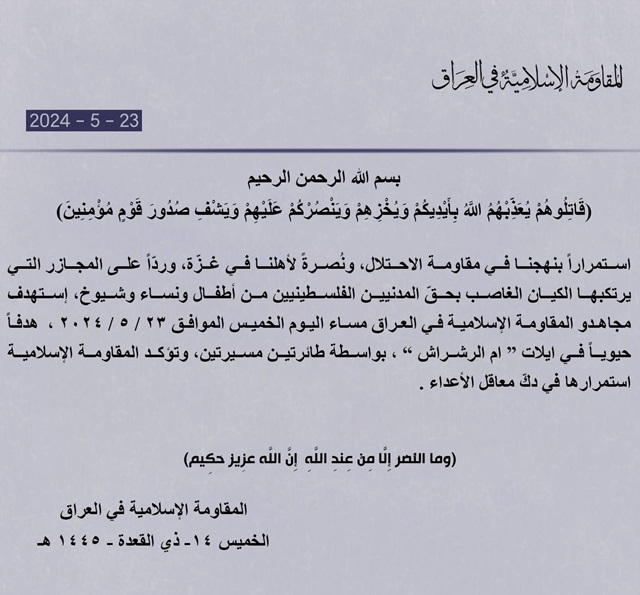 استمراراً بنهجنا في مقاومة الاحتلال، ونُصرةً لأهلنا في غزّة، وردّاً على المجازر التي يرتكبها الكيان الغاصب بحقّ المدنيين الفلسطينيين من أطفال ونساء وشيوخ، إستهدف مجاهدو المقاومة الإسلامية في العراق مساء اليوم الخميس الموافق 23 / 5 / 2024 ، هدفاً حيوياً في ايلات “ ام الرشراش ” ، بواسطة طائرتين مسيرتين، وتؤكد المقاومة الإسلامية استمرارها في دكّ معاقل الأعداء .