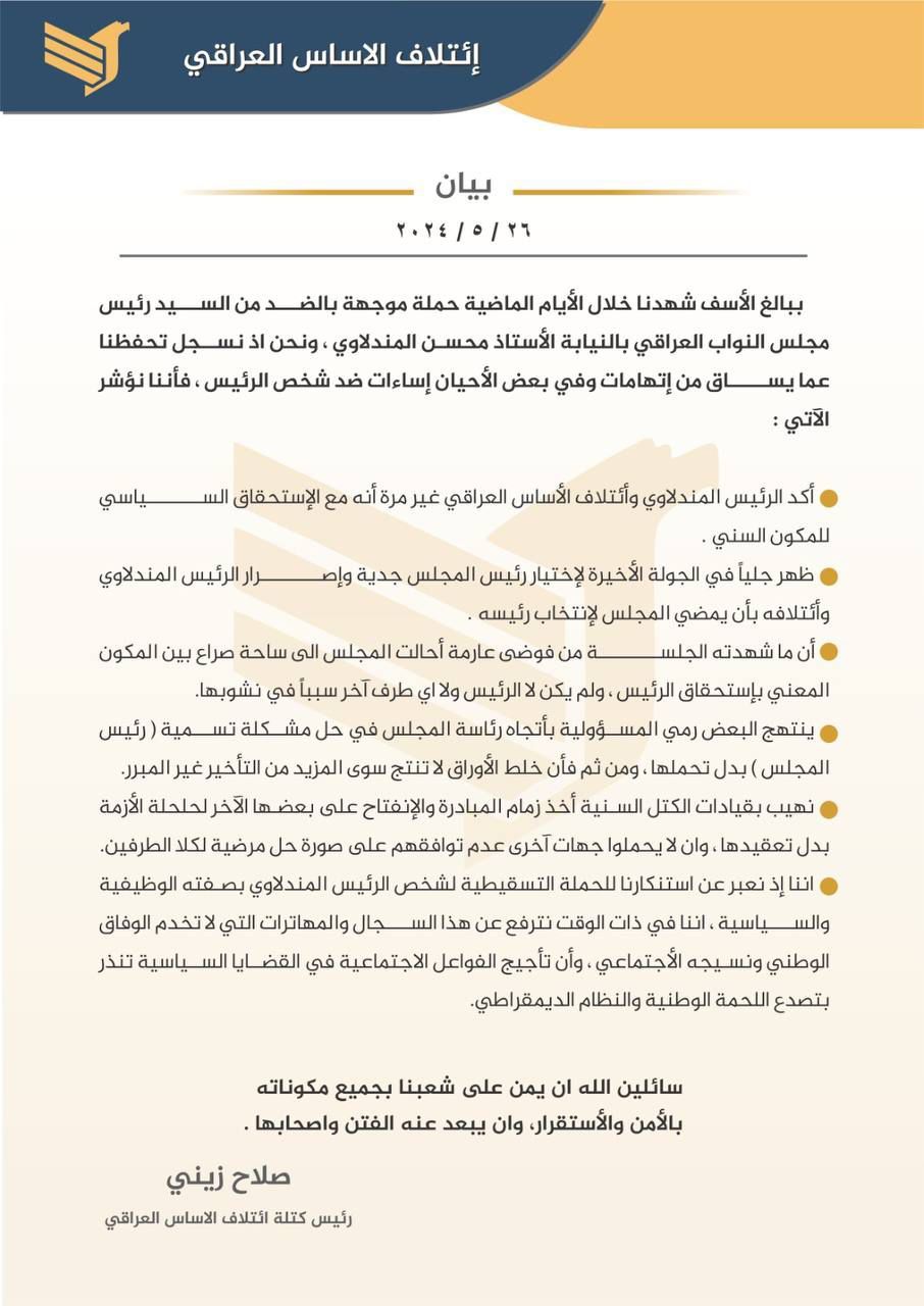 رفض تحالف الاساس الاتهامات الموجه لرئيسه محسن المندلاوي بشان خلافات المكون السني على منصب رئيس البرلمان.