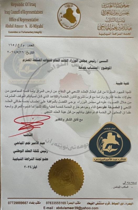 دعا رئيس كتلة العقد الوطني ، النائب عبد الأمير المياحي ، رئيس مجلس الوزراء والقائد العام للقوات المسلحة " لاحتساب خدمة مقاتلي الحــشـد الشــعــبــي المفسوخة عقودهم .