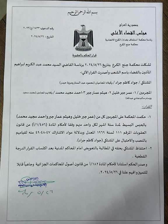وقالت المحكمة بحسب وثيقة، انه "حكمت المحكمة على المجرمين كل من (عمر جبر خليل وهيثم عمار جبر واحمد مجيد محمد) بالحبس البسيط لمدة ستة أشهر لكل واحد منهم وفقا لأحكام المادة (456/1/أ) من قانون العقوبات المرقم 111 لسنة 1969 المعدل وبدلالة مواد الاشتراك (47-48-49) منه لقيامهم بالنصب والاحتيال على المشتكي (جواد كاظم جراد)".
