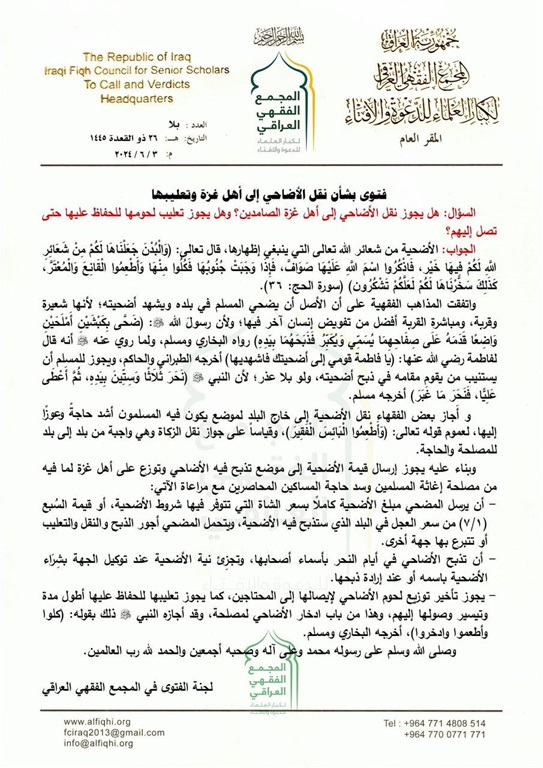 أجاز المجمع الفقهي العراقي، اليوم الاثنين، إرسال قيمة الأضحية إلى اهالي غزة.