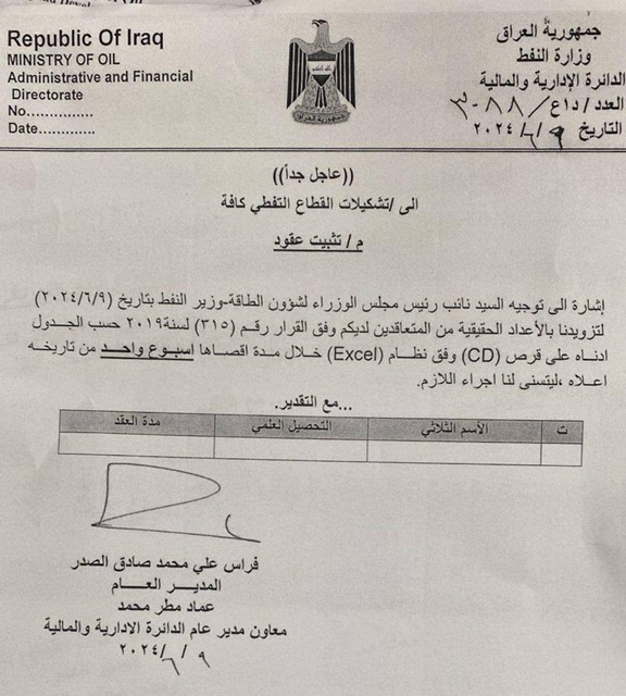 شرعت وزارة النفط، اليوم الأحد، (9 حزيران 2024)، بتثبيت أصحاب العقود في ملاكات الوزارة.
