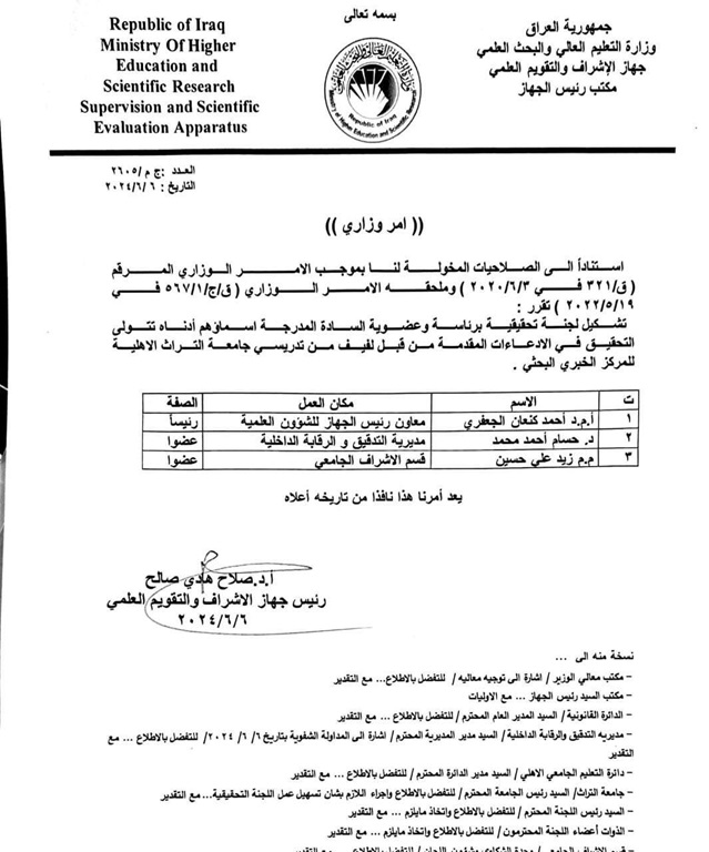 أظهرت وثيقة صادرة عن وزارة التعليم العالي والبحث العلمي، اليوم الأحد (9 حزيران 2024)، أمراً وزارياً بتشكيل لجنة تحقيقية بحق جامعة التراث الأهلية بعد أن انتشرت ادعاءات بتسرب الأسئلة الامتحانية.