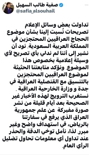 نفت سفيرة العراق في السعودية صفية السهيل ادلاءها باي تصريح بشأن الحجاج العراقيين المحتجزين في المملكة .